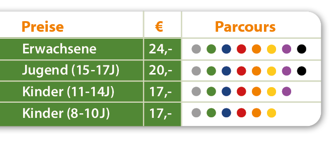 bis 14 Jahre 17€, Jugendliche ab 15 Jahre 20€